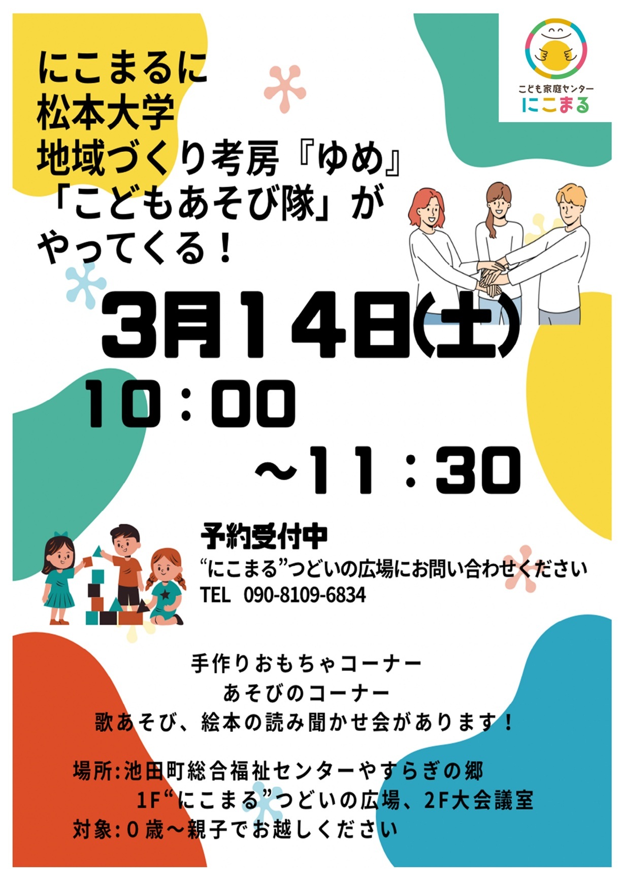 松本大学地域づくり考房『ゆめ』「こどもあそび隊」がにこまるにやってきます!手作りおもちゃや、あそびのコーナーなど、一緒に楽しみましょう!(要予約)
